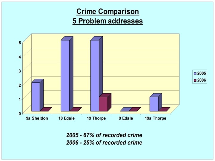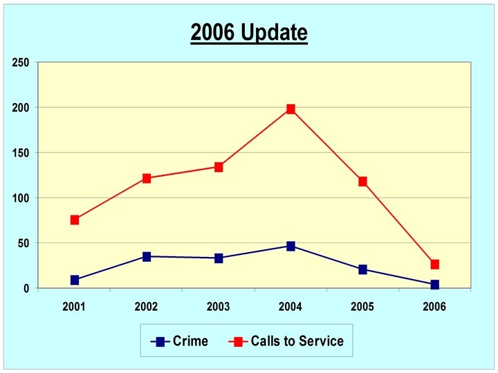ASSESSMENT – Police 2006 Update • 91% Reduction in Overall Crime • Damage 93% Reduction (1 crime) • Violent Crime – No recorded offences • Burglary 83% Reduction (1 crime) • Drugs – No recorded offences • 86% Reduction in Calls to Service