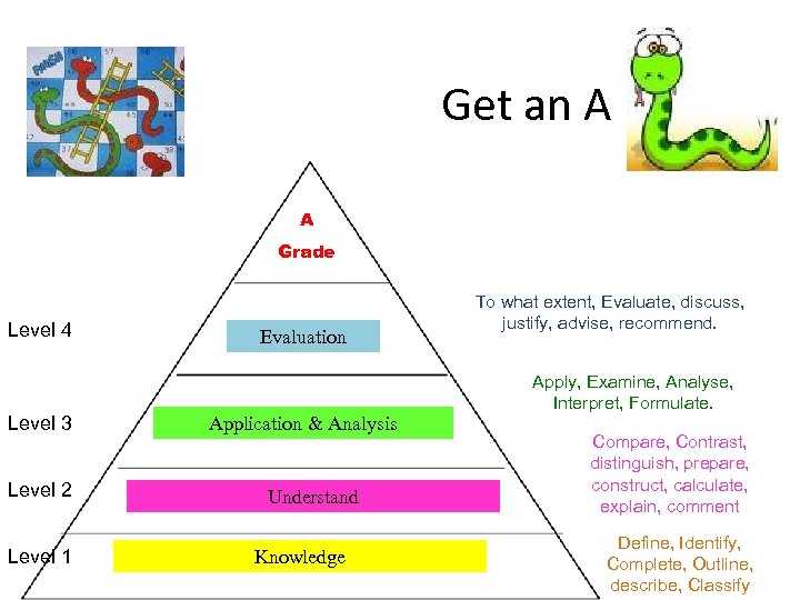 Get an A A Grade Level 4 Level 3 Level 2 Level 1 Evaluation Application & Analysis Understand Knowledge To what extent, Evaluate, discuss, justify, advise, recommend. Apply, Examine, Analyse, Interpret, Formulate. Compare, Contrast, distinguish, prepare, construct, calculate, explain, comment Define, Identify, Complete, Outline, describe, Classify