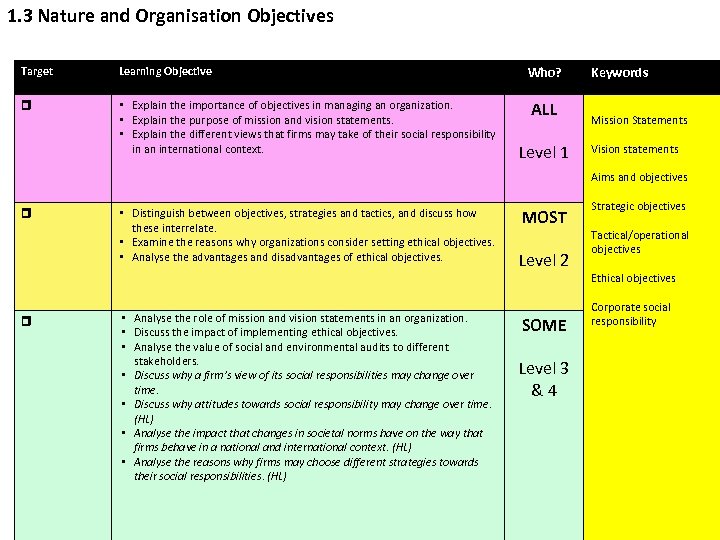 1. 3 Nature and Organisation Objectives Target Learning Objective • Explain the importance of objectives in managing an organization. • Explain the purpose of mission and vision statements. • Explain the different views that firms may take of their social responsibility in an international context. Who? ALL Level 1 Keywords Mission Statements Vision statements Aims and objectives • Distinguish between objectives, strategies and tactics, and discuss how these interrelate. • Examine the reasons why organizations consider setting ethical objectives. • Analyse the advantages and disadvantages of ethical objectives. • Analyse the role of mission and vision statements in an organization. • Discuss the impact of implementing ethical objectives. • Analyse the value of social and environmental audits to different stakeholders. • Discuss why a firm’s view of its social responsibilities may change over time. • Discuss why attitudes towards social responsibility may change over time. (HL) • Analyse the impact that changes in societal norms have on the way that firms behave in a national and international context. (HL) • Analyse the reasons why firms may choose different strategies towards their social responsibilities. (HL) MOST Level 2 SOME Level 3 & 4 Strategic objectives Tactical/operational objectives Ethical objectives Corporate social responsibility