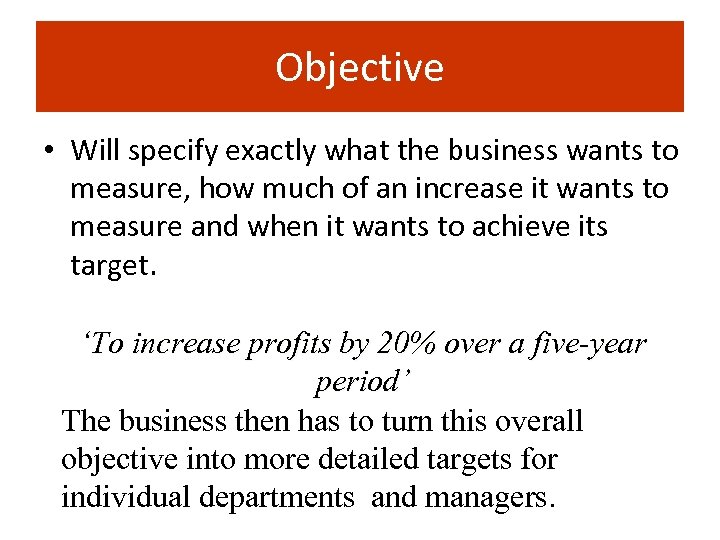 Objective • Will specify exactly what the business wants to measure, how much of an increase it wants to measure and when it wants to achieve its target. ‘To increase profits by 20% over a five-year period’ The business then has to turn this overall objective into more detailed targets for individual departments and managers.