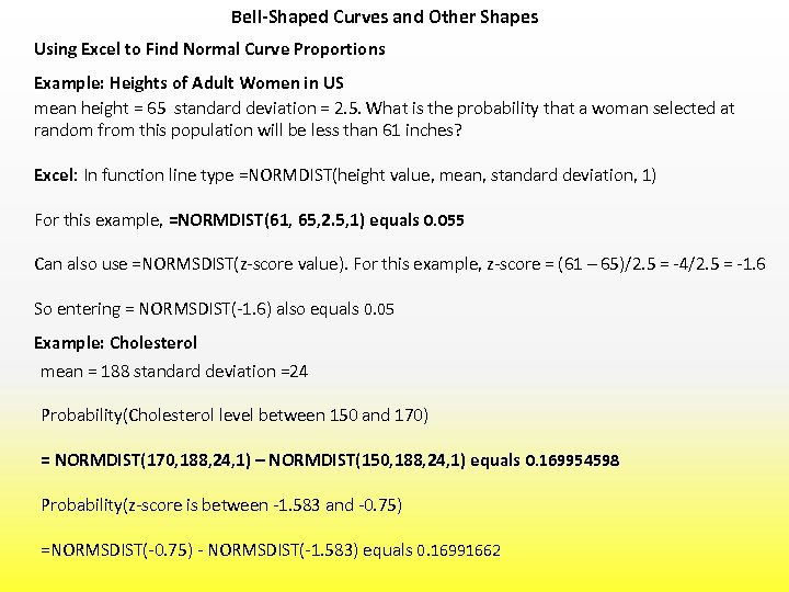 Bell-Shaped Curves and Other Shapes Using Excel to Find Normal Curve Proportions Example: Heights of Adult Women in US mean height = 65 standard deviation = 2. 5. What is the probability that a woman selected at random from this population will be less than 61 inches? Excel: In function line type =NORMDIST(height value, mean, standard deviation, 1) For this example, =NORMDIST(61, 65, 2. 5, 1) equals 0. 055 Can also use =NORMSDIST(z-score value). For this example, z-score = (61 – 65)/2. 5 = -4/2. 5 = -1. 6 So entering = NORMSDIST(-1. 6) also equals 0. 05 Example: Cholesterol mean = 188 standard deviation =24 Probability(Cholesterol level between 150 and 170) = NORMDIST(170, 188, 24, 1) – NORMDIST(150, 188, 24, 1) equals 0. 169954598 Probability(z-score is between -1. 583 and -0. 75) =NORMSDIST(-0. 75) - NORMSDIST(-1. 583) equals 0. 16991662