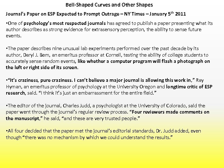 Bell-Shaped Curves and Other Shapes Journal’s Paper on ESP Expected to Prompt Outrage – NY Times – January 5 th 2011 • One of psychology’s most respected journals has agreed to publish a paper presenting what its author describes as strong evidence for extrasensory perception, the ability to sense future events. • The paper describes nine unusual lab experiments performed over the past decade by its author, Daryl J. Bem, an emeritus professor at Cornell, testing the ability of college students to accurately sense random events, like whether a computer program will flash a photograph on the left or right side of its screen. • “It’s craziness, pure craziness. I can’t believe a major journal is allowing this work in, ” Ray Hyman, an emeritus professor of psychology at the University Oregon and longtime critic of ESP research, said. “I think it’s just an embarrassment for the entire field. ” • The editor of the journal, Charles Judd, a psychologist at the University of Colorado, said the paper went through the journal’s regular review process. “Four reviewers made comments on the manuscript, ” he said, “and these are very trusted people. ” • All four decided that the paper met the journal’s editorial standards, Dr. Judd added, even though “there was no mechanism by which we could understand the results. ”