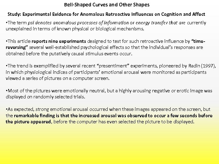 Bell-Shaped Curves and Other Shapes Study: Experimental Evidence for Anomalous Retroactive Influences on Cognition and Affect • The term psi denotes anomalous processes of information or energy transfer that are currently unexplained in terms of known physical or biological mechanisms. • This article reports nine experiments designed to test for such retroactive influence by “timereversing” several well-established psychological effects so that the individual’s responses are obtained before the putatively causal stimulus events occur. • The trend is exemplified by several recent “presentiment” experiments, pioneered by Radin (1997), in which physiological indices of participants’ emotional arousal were monitored as participants viewed a series of pictures on a computer screen. • Most of the pictures were emotionally neutral, but a highly arousing negative or erotic image was displayed on randomly selected trials. • As expected, strong emotional arousal occurred when these images appeared on the screen, but the remarkable finding is that the increased arousal was observed to occur a few seconds before the picture appeared, before the computer has even selected the picture to be displayed.