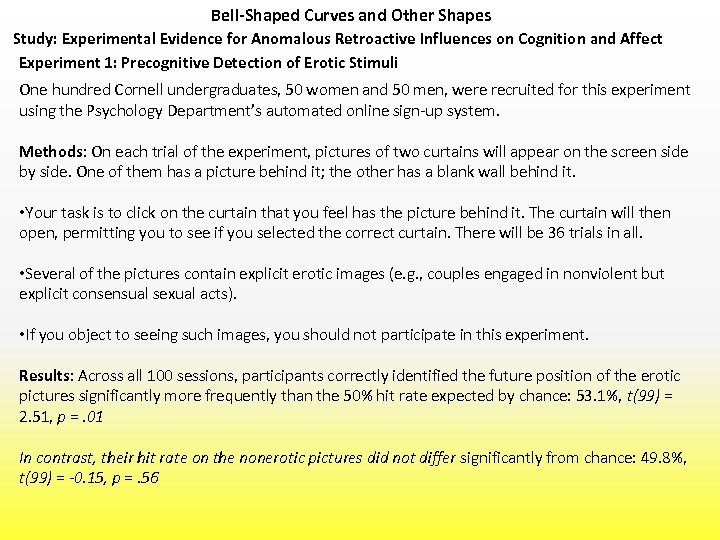 Bell-Shaped Curves and Other Shapes Study: Experimental Evidence for Anomalous Retroactive Influences on Cognition and Affect Experiment 1: Precognitive Detection of Erotic Stimuli One hundred Cornell undergraduates, 50 women and 50 men, were recruited for this experiment using the Psychology Department’s automated online sign-up system. Methods: On each trial of the experiment, pictures of two curtains will appear on the screen side by side. One of them has a picture behind it; the other has a blank wall behind it. • Your task is to click on the curtain that you feel has the picture behind it. The curtain will then open, permitting you to see if you selected the correct curtain. There will be 36 trials in all. • Several of the pictures contain explicit erotic images (e. g. , couples engaged in nonviolent but explicit consensual sexual acts). • If you object to seeing such images, you should not participate in this experiment. Results: Across all 100 sessions, participants correctly identified the future position of the erotic pictures significantly more frequently than the 50% hit rate expected by chance: 53. 1%, t(99) = 2. 51, p =. 01 In contrast, their hit rate on the nonerotic pictures did not differ significantly from chance: 49. 8%, t(99) = -0. 15, p =. 56