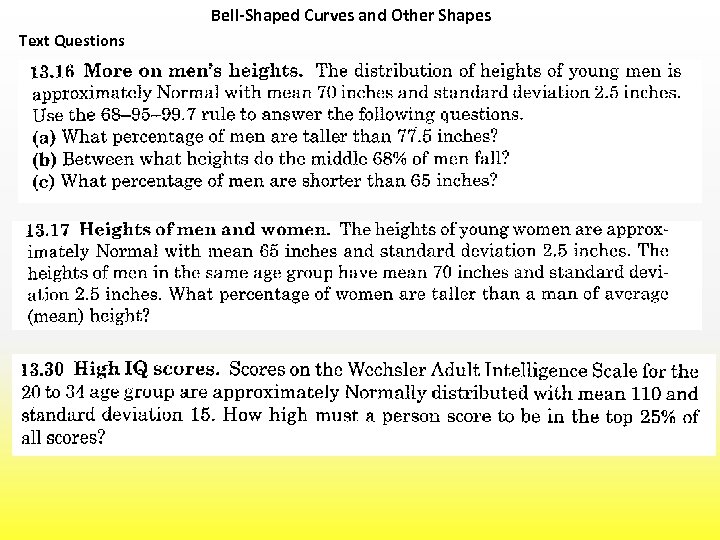 Thought Questions Bell-Shaped Curves and Other Shapes 1. The heights of adult women in the United States follow, at least approximately, a bell-shaped curve. What do you think this means? 2. What does it mean to say that a man’s weight is in the 30 th percentile for all adult males? 3. A “standardized score” is simply the number of standard deviations an individual falls above or below the mean for the whole group. Male heights have a mean of 70 inches and a standard deviation of 3 inches. Female heights have a mean of 65 inches and a standard deviation of 2 ½ inches. Thus, a man who is 73 inches tall has a standardized score of 1. What is the standardized score corresponding to your own height?