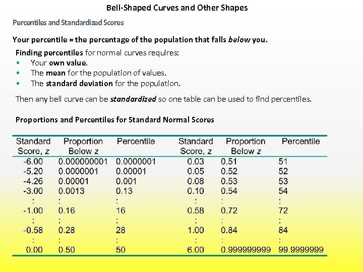 Bell-Shaped Curves and Other Shapes Percentiles and Standardized Scores Your percentile = the percentage of the population that falls below you. Finding percentiles for normal curves requires: • Your own value. • The mean for the population of values. • The standard deviation for the population. Then any bell curve can be standardized so one table can be used to find percentiles. Proportions and Percentiles for Standard Normal Scores
