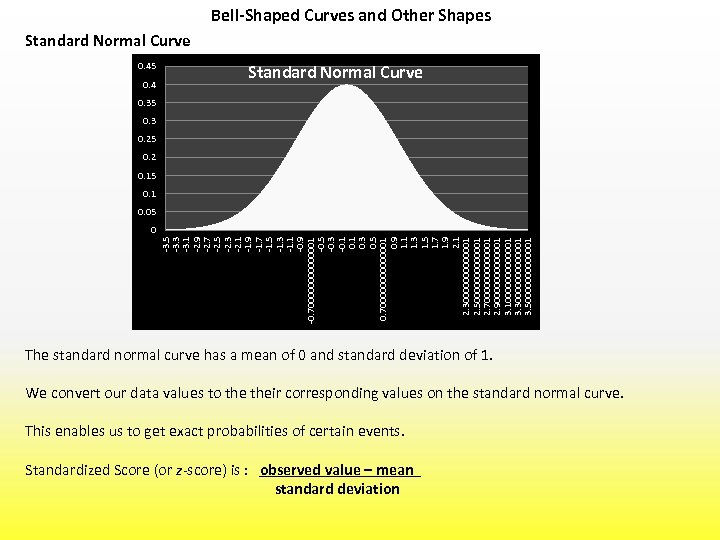 Bell-Shaped Curves and Other Shapes Standard Normal Curve 0. 45 0. 4 Standard Normal Curve 0. 35 0. 3 0. 25 0. 2 0. 15 0. 1 0. 05 -3. 3 -3. 1 -2. 9 -2. 7 -2. 5 -2. 3 -2. 1 -1. 9 -1. 7 -1. 5 -1. 3 -1. 1 -0. 9 -0. 700000001 -0. 5 -0. 3 -0. 1 0. 3 0. 5 0. 700000001 0. 9 1. 1 1. 3 1. 5 1. 7 1. 9 2. 1 2. 30000001 2. 50000001 2. 70000001 2. 90000001 3. 10000001 3. 30000001 3. 50000001 0 The standard normal curve has a mean of 0 and standard deviation of 1. We convert our data values to their corresponding values on the standard normal curve. This enables us to get exact probabilities of certain events. Standardized Score (or z-score) is : observed value – mean standard deviation