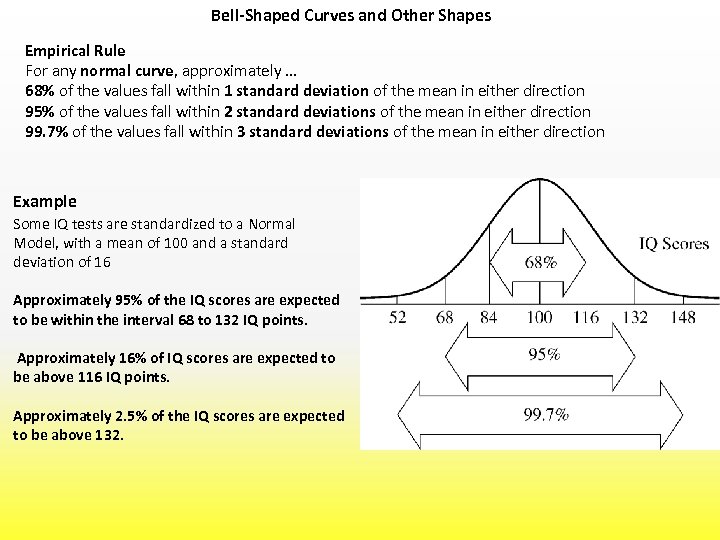 Bell-Shaped Curves and Other Shapes Empirical Rule For any normal curve, approximately … 68% of the values fall within 1 standard deviation of the mean in either direction 95% of the values fall within 2 standard deviations of the mean in either direction 99. 7% of the values fall within 3 standard deviations of the mean in either direction Example Some IQ tests are standardized to a Normal Model, with a mean of 100 and a standard deviation of 16 Approximately 95% of the IQ scores are expected to be within the interval 68 to 132 IQ points. Approximately 16% of IQ scores are expected to be above 116 IQ points. Approximately 2. 5% of the IQ scores are expected to be above 132.