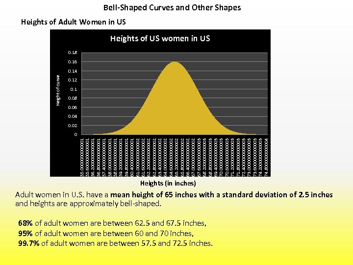 55. 0000001 55. 60000001 56. 20000001 56. 80000001 57. 40000001 58. 60000001 59. 20000001 59. 80000001 60. 40000001 61. 0000002 61. 60000002 62. 20000002 62. 80000002 63. 40000002 64. 60000002 65. 20000002 65. 80000002 66. 40000002 67. 60000003 68. 20000003 68. 80000003 69. 40000003 70. 60000003 71. 20000003 71. 80000003 72. 40000003 73. 60000003 74. 20000003 74. 80000004 Height of curve Bell-Shaped Curves and Other Shapes Heights of Adult Women in US Heights of US women in US 0. 18 0. 16 0. 14 0. 12 0. 1 0. 08 0. 06 0. 04 0. 02 0 Heights (in inches) Adult women in U. S. have a mean height of 65 inches with a standard deviation of 2. 5 inches and heights are approximately bell-shaped. 68% of adult women are between 62. 5 and 67. 5 inches, 95% of adult women are between 60 and 70 inches, 99. 7% of adult women are between 57. 5 and 72. 5 inches.