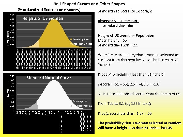 0. 18 0. 16 0. 14 0. 12 0. 1 0. 08 0. 06 0. 04 0. 02 0 Heights of US women observed value – mean standard deviation Remaining Area less 61 inches 0. 45 0. 4 0. 35 0. 3 0. 25 0. 2 0. 15 0. 1 0. 05 0 Height of US women - Population Mean height = 65 Standard deviation = 2. 5 What is the probability that a woman selected at random from this population will be less than 61 inches? Probability(height is less than 61 inches)? Standard Normal Curve z-score = (61 – 65)/2. 5 = -4/2. 5 = -1. 6 61 is 1. 6 standardized scores from the mean of 65. Remaing area Area less than -1. 6 -3. 5 -3. 2 -2. 9 -2. 6 -2. 3 -2 -1. 7 -1. 4 -1. 1 -0. 8 -0. 5 -0. 2 0. 1 0. 4 0. 700000001 1 1. 3 1. 6 1. 9 2. 2 2. 50000001 2. 80000001 3. 10000001 3. 40000001 Axis Title 55. 0000001 55. 70000001 56. 40000001 57. 10000001 57. 80000001 58. 50000001 59. 20000001 59. 90000001 60. 60000002 61. 30000002 62. 70000002 63. 40000002 64. 10000002 64. 80000002 65. 50000002 66. 20000002 66. 90000002 67. 60000003 68. 30000003 69. 70000003 70. 40000003 71. 10000003 71. 80000003 72. 50000003 73. 20000003 73. 90000003 74. 60000003 Height of curve Bell-Shaped Curves and Other Shapes Standardized Scores (or z-scores) Standardized Score (or z-score) is From Tables 8. 1 (pg 157 in text): Prob(z-score less than -1. 6) =. 05 The probability that a women selected at random will have a height less than 61 inches is 0. 05.