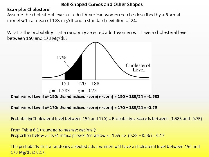 Bell-Shaped Curves and Other Shapes Example: Cholesterol Assume the cholesterol levels of adult American women can be described by a Normal model with a mean of 188 mg/d. L and a standard deviation of 24. What is the probability that a randomly selected adult women will have a cholesteral level between 150 and 170 Mg/d. L? Cholesterol Level of 150: Standardized score(z-score) = 150 – 188/24 = -1. 583 Cholesterol Level of 170: Standardized score(z-score) = 170 – 188/24 = -0. 75 Probability(Cholesterol level between 150 and 170) = Probability(z-score is between -1. 583 and -0. 75) From Table 8. 1 (rounded to nearest decimal): Proportion below z=-0. 74 minus proportion below z=-1. 55 => (0. 23 – 0. 06) = 0. 17 The probability that a randomly selected adult women will have a cholesteral level between 150 and 170 Mg/d. L is 0. 17.