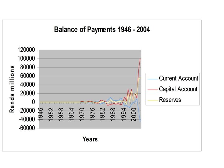 Bo. P (Reserves Cont. ) • Foreign exchange reserves are the amount of foreign currency which Central Banks (Reserve Banks) hold on behalf of the country • SA holds reserves in US Dollars, Japanese Yen, British Pounds, Euros and gold • Measure of whether enough Foreign Exchange Reserves are held = how many weeks worth of imports could your reserves pay for • Example: SA had enough reserves to pay for only 7 weeks of imports in 1996, in 2002 reserves were sufficient to purchase 20 weeks worth of imports • Minimum recommended amount of Reserves = value of 12 weeks of imports