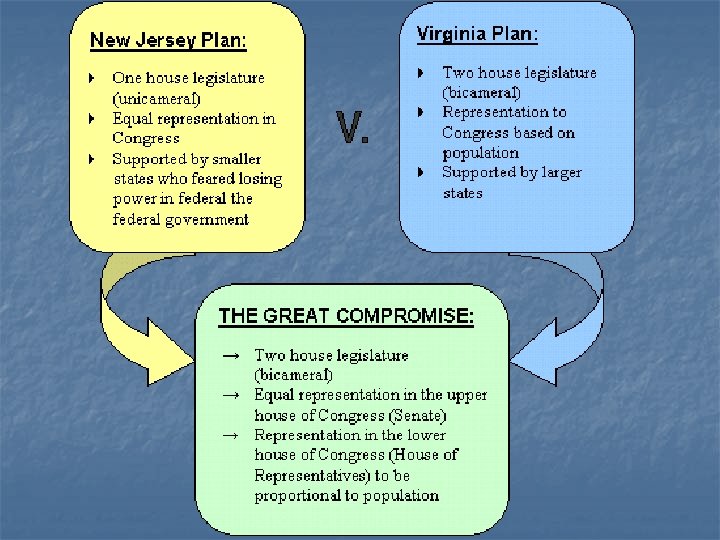 Virginia Plan n n Wanted 3 branches: legislative, executive and judicial. Also wanted to base representation on population. n n The more people in a state, the more votes that state receives. Became known as the “Big State” Plan.