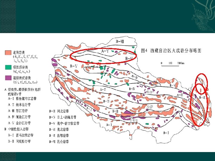 Мафические породы: главная часть— океанические породы, 205 2. массивов(групп), площадь 7195 км. Киншацзянский (Верхная часть Янцзы) пояс Мало палеотетисских породы: Ланьцанцзянский(Верхная часть Река меконг) пояс Киншацзянский (Верхная часть Янцзы) пояс Много неотетисских породы: 190 массивов(групп) Ялуцзанпуцзянский пояс(A-Ⅰ) Намуцуоский пояс(A-Ⅱ) Баньгонцуо-Пуцзянский пояс(A-Ⅲ)
