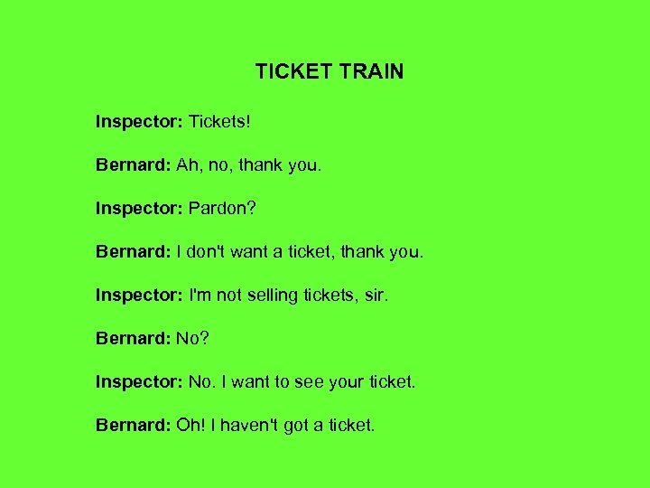 TICKET TRAIN Inspector: Tickets! Bernard: Ah, no, thank you. Inspector: Pardon? Bernard: I don't want a ticket, thank you. Inspector: I'm not selling tickets, sir. Bernard: No? Inspector: No. I want to see your ticket. Bernard: Oh! I haven't got a ticket.