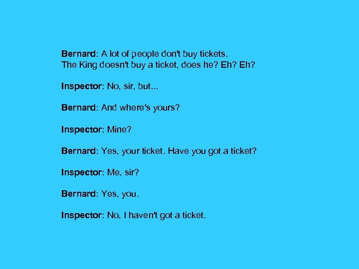 Bernard: A lot of people don't buy tickets. The King doesn't buy a ticket, does he? Eh? Inspector: No, sir, but. . . Bernard: And where's yours? Inspector: Mine? Bernard: Yes, your ticket. Have you got a ticket? Inspector: Me, sir? Bernard: Yes, you. Inspector: No, I haven't got a ticket.