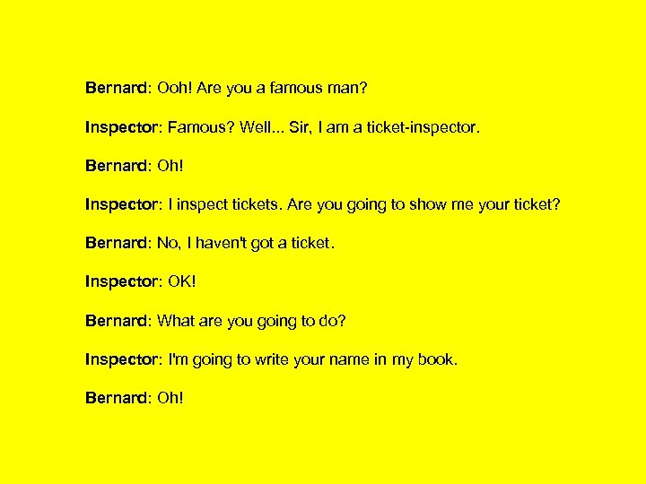 Bernard: Ooh! Are you a famous man? Inspector: Famous? Well. . . Sir, I am a ticket-inspector. Bernard: Oh! Inspector: I inspect tickets. Are you going to show me your ticket? Bernard: No, I haven't got a ticket. Inspector: OK! Bernard: What are you going to do? Inspector: I'm going to write your name in my book. Bernard: Oh!