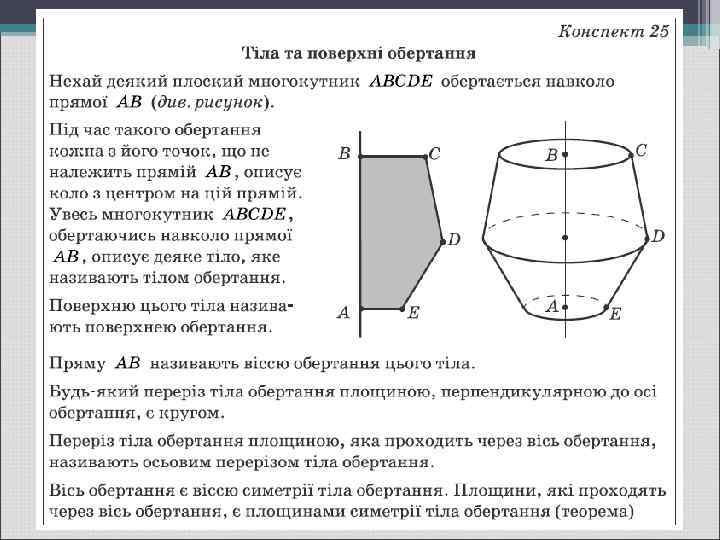 Засвоєння знань • • 1. Означення тіла обертання. 2. Означення поверхні обертання. 3. Означення осі обертання тіла. 4. Означення осьового перерізу тіла обертання. • 5. Елементи симетрії тіла обертання.