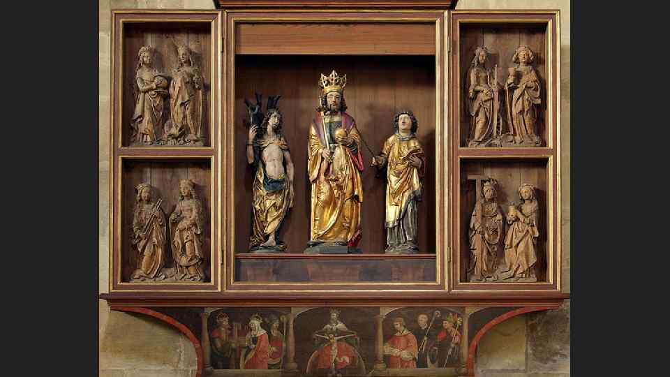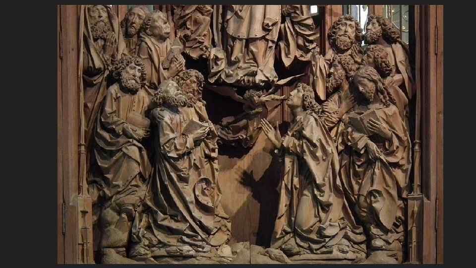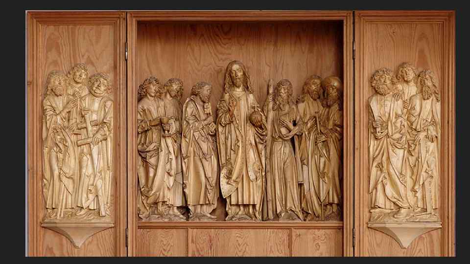 АЛТАРЬ СВЯТОЙ КРОВИ Церковь Св. Якова в Ротенбургена-Таубере знаменита своим алтарем Святой Крови. По преданию в капсуле из горного хрусталя хранятся три капли крови Иисуса Христа. Капсула вмонтирована в золоченый крест, изготовленный около 1270 г. Городской совет стремился придать достойное обрамление реликвии и пригласил скульптора Тильмана Рименшнейдера изготить алтарь. Работы проводились в мастерской ротенбурского столяра Эрхарда Гаршнера (1499 -1505 гг). Резная композиция полностью выполнена из липового дерева и вначале была обработана только яичным желтком для получения необходимого оттенка.
