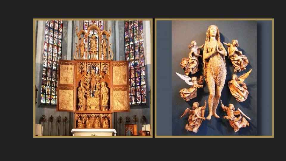 МЮНСТЕРСКИЙ АЛТАРЬ В центральной части алтаря изображена поддерживаемая ангелами парящая в воздухе Мария Магдалина. После вознесения Христа Магдалина каялась и предавалась молитвам, и ей казалось, что во время молитвы она воспаряет, поддерживаемая ангелами. Уже в этой первой своей работе Рименшнейдер проявил непревзойденное мастерство резчика по дереву. Струящиеся локоны волос, вся пластика фигуры, покатые плечи, плавные очертания женственных форм создают пленительный женский образ. В лице Магдалины уже виден идеал женской красоты – миловидное овальное лицо с маленьким ртом и заостренным подбородком, с неизменным выражением сосредоточенности и печали на лице.