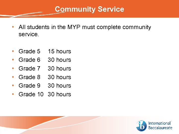 Community Service • All students in the MYP must complete community service. • • • Grade 5 Grade 6 Grade 7 Grade 8 Grade 9 Grade 10 15 hours 30 hours 30 hours