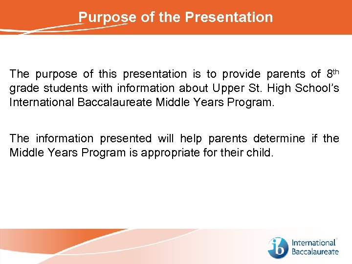 Purpose of the Presentation The purpose of this presentation is to provide parents of 8 th grade students with information about Upper St. High School’s International Baccalaureate Middle Years Program. The information presented will help parents determine if the Middle Years Program is appropriate for their child.