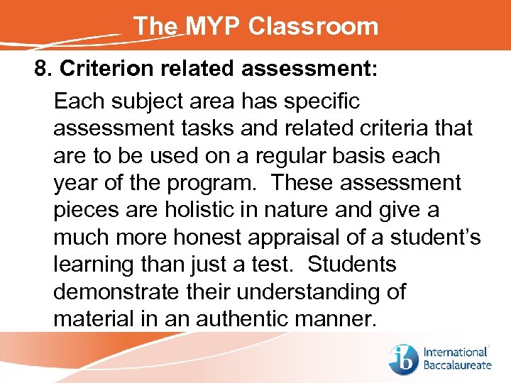 The MYP Classroom 8. Criterion related assessment: Each subject area has specific assessment tasks and related criteria that are to be used on a regular basis each year of the program. These assessment pieces are holistic in nature and give a much more honest appraisal of a student’s learning than just a test. Students demonstrate their understanding of material in an authentic manner.