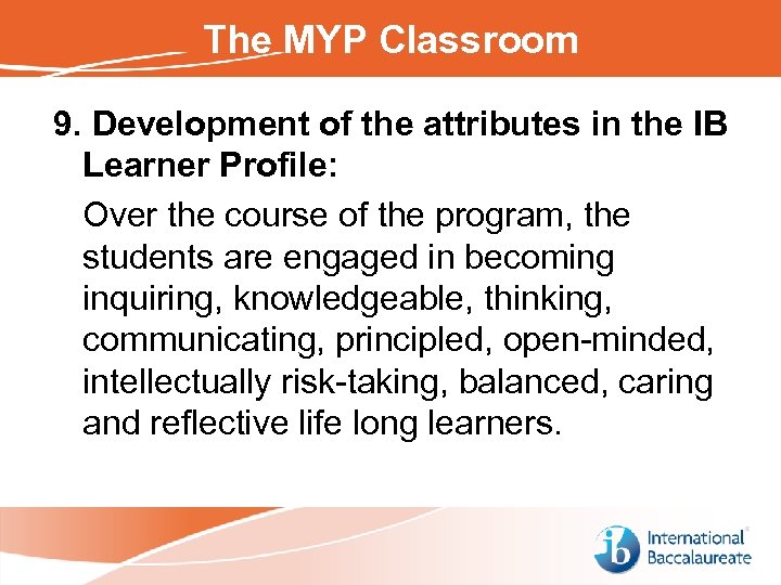 The MYP Classroom 9. Development of the attributes in the IB Learner Profile: Over the course of the program, the students are engaged in becoming inquiring, knowledgeable, thinking, communicating, principled, open-minded, intellectually risk-taking, balanced, caring and reflective life long learners.