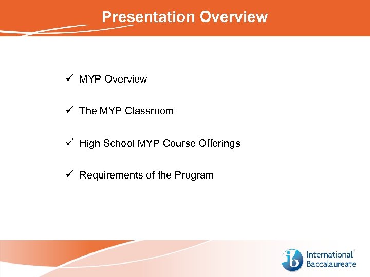 Presentation Overview ü MYP Overview ü The MYP Classroom ü High School MYP Course Offerings ü Requirements of the Program