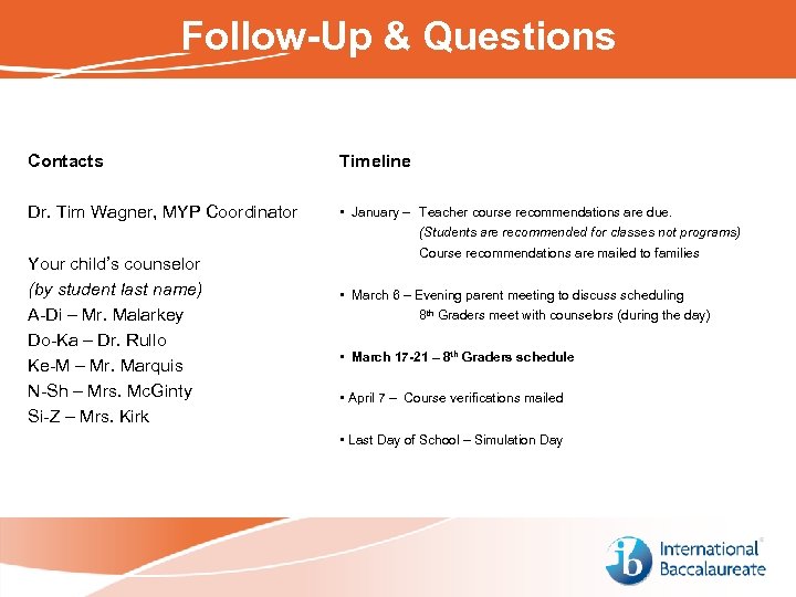 Follow-Up & Questions Contacts Timeline Dr. Tim Wagner, MYP Coordinator • January – Teacher course recommendations are due. (Students are recommended for classes not programs) Your child’s counselor (by student last name) A-Di – Mr. Malarkey Do-Ka – Dr. Rullo Ke-M – Mr. Marquis N-Sh – Mrs. Mc. Ginty Si-Z – Mrs. Kirk Course recommendations are mailed to families • March 6 – Evening parent meeting to discuss scheduling 8 th Graders meet with counselors (during the day) • March 17 -21 – 8 th Graders schedule • April 7 – Course verifications mailed • Last Day of School – Simulation Day