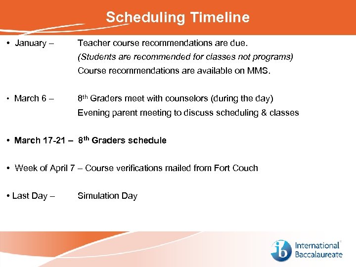 Scheduling Timeline • January – Teacher course recommendations are due. (Students are recommended for classes not programs) Course recommendations are available on MMS. • March 6 – 8 th Graders meet with counselors (during the day) Evening parent meeting to discuss scheduling & classes • March 17 -21 – 8 th Graders schedule • Week of April 7 – Course verifications mailed from Fort Couch • Last Day – Simulation Day