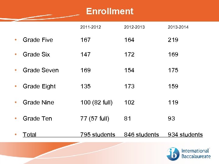 Enrollment 2011 -2012 -2013 -2014 • Grade Five 167 164 219 • Grade Six 147 172 169 • Grade Seven 169 154 175 • Grade Eight 135 173 159 • Grade Nine 100 (82 full) 102 119 • Grade Ten 77 (57 full) 81 93 • Total 795 students 846 students 934 students