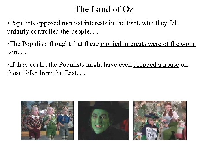 The Land of Oz • Populists opposed monied interests in the East, who they felt unfairly controlled the people. . . • The Populists thought that these monied interests were of the worst sort. . . • If they could, the Populists might have even dropped a house on those folks from the East. . .
