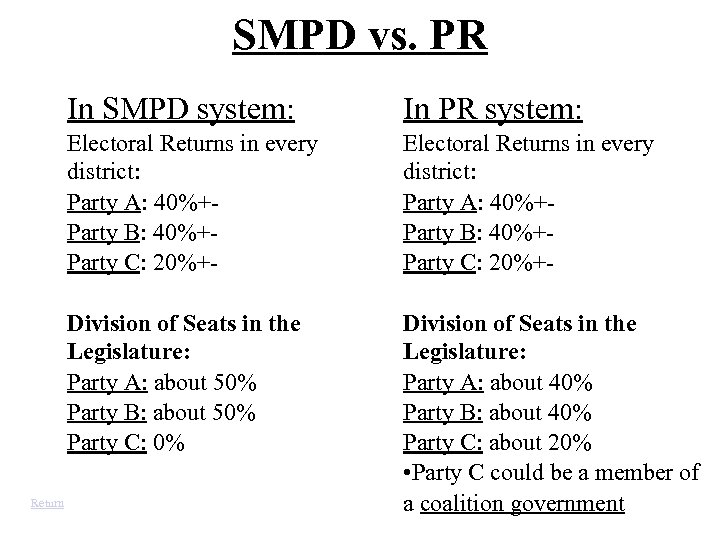 SMPD vs. PR In SMPD system: Electoral Returns in every district: Party A: 40%+Party B: 40%+Party C: 20%+- Division of Seats in the Legislature: Party A: about 50% Party B: about 50% Party C: 0% Return In PR system: Division of Seats in the Legislature: Party A: about 40% Party B: about 40% Party C: about 20% • Party C could be a member of a coalition government