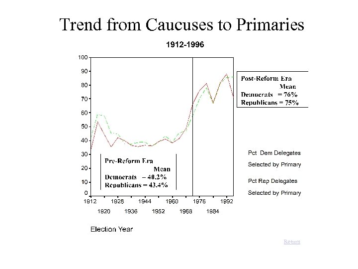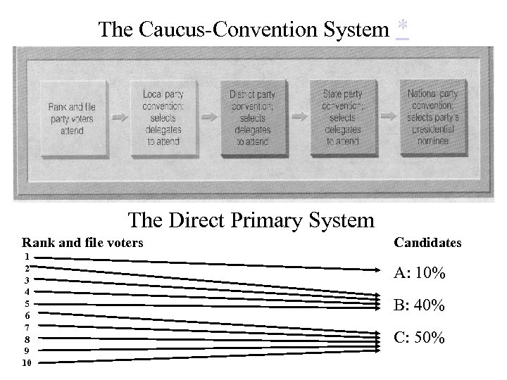 The Caucus-Convention System * The Direct Primary System Rank and file voters 1 2 3 4 5 6 7 8 9 10 Candidates A: 10% B: 40% C: 50%