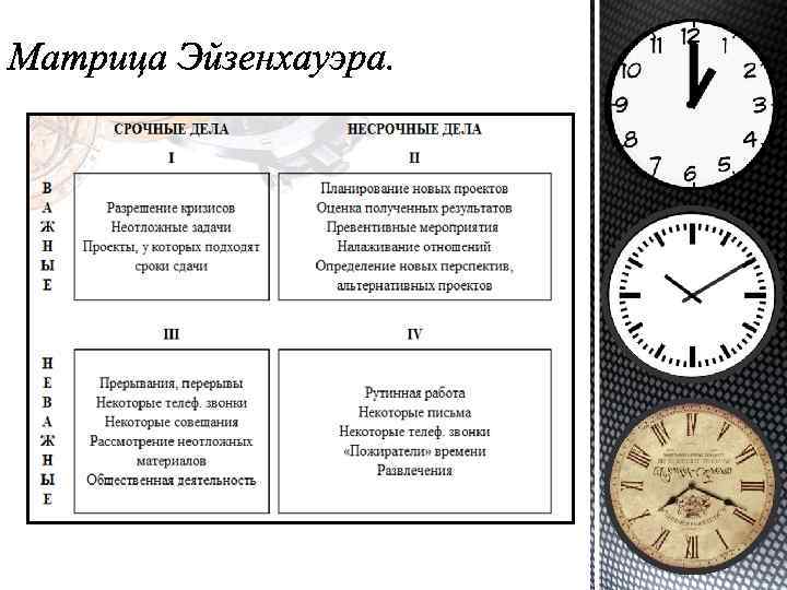 Time management - это акт или процесс планирования и осуществления сознательного контроля над количеством времени, потраченного на конкретные виды деятельности, особенно в целях повышения эффективности, результативности и производительности. Матрица Эйзенхауэра - один из методов тайм-менеджмента для определения приоритетов дел дня. Дефицит рабочего времени - нехватка временного ресурса, вызванная неправильной организацией работником своей деятельности, либо неграмотной организацией деятельности руководством, что приводит к спешке, затягиванию выполнения работ, заданий, некачественной работе, потерям в производстве, браку и т. д. что в конечном итоге существенно влияет на эффективность и результаты работы всего предприятия. Хронометраж - метод изучения затрат времени с помощью фиксации и замеров продолжительности выполняемых действий.