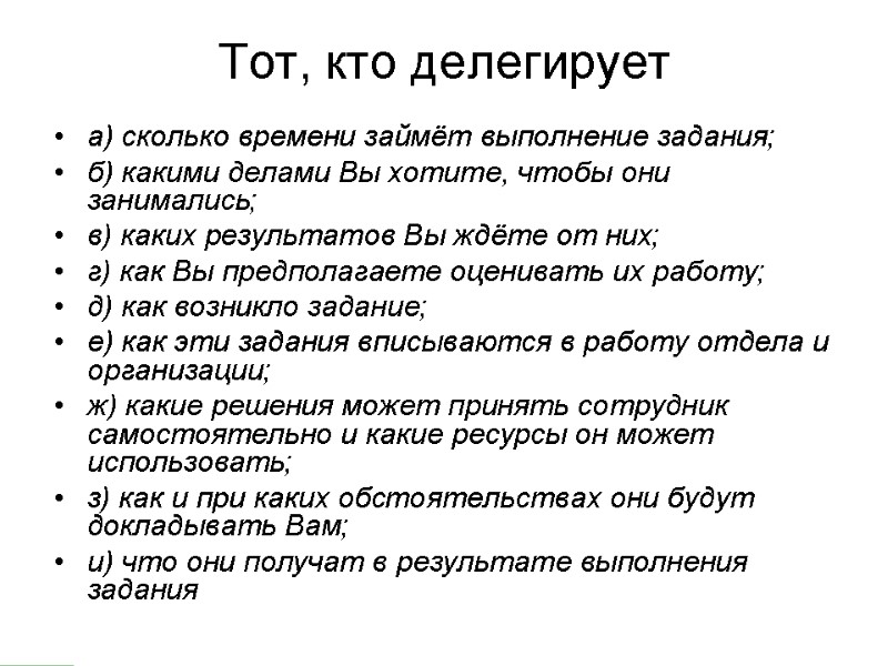 Сопротивление делегированию Вы настолько заняты работой, что у Вас нет времени на объяснение делегируемых задач Вы, возможно, сами не настолько хорошо осведомлены о задачах и проблемах, чтобы знать, что именно нужно делегировать своим сотрудникам Вы отказываетесь от делегирования, поскольку считаете, что можете сами выполнить работу быстрее , чем Ваши сотрудники, и таким образом пытаетесь сэкономить время