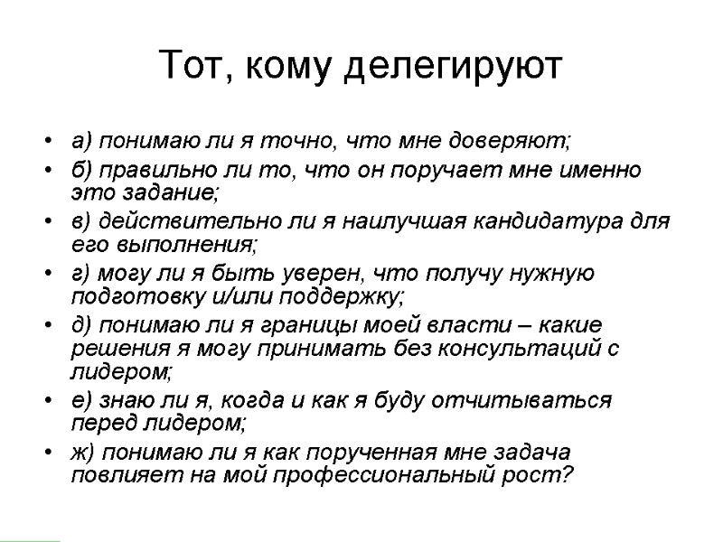 Сопротивление делегированию Вас тревожит возможность потерять контроль над делом, как только Вы его выпустите из рук Вы сомневаетесь в возможностях и способностях сотрудника и не хотите рисковать Вы боитесь потерять часть своего авторитета и имиджа, если то, что вы до сих пор делали сами, теперь берет на себя Ваш сотрудник Вы не знаете, как Вам следует реагировать, если подчиненный отклонит делегирование
