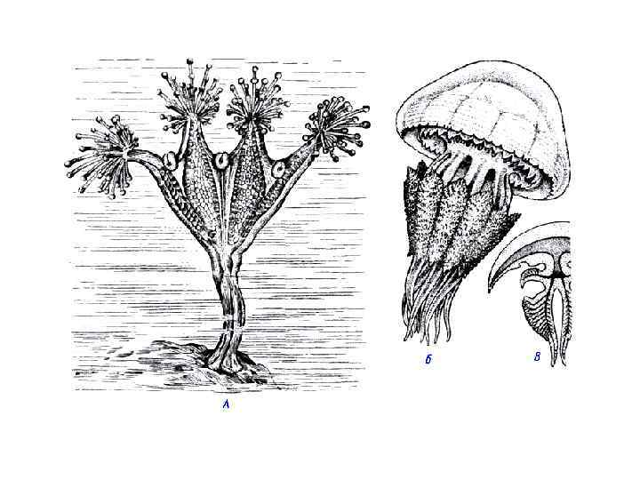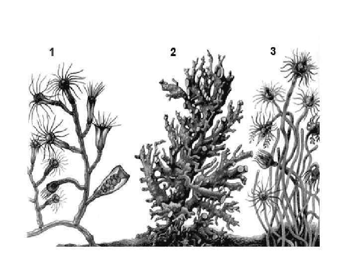 Морские гидроидные полипы • Вторая группа особей в колонии бластостили в форме стебелька без рта и щупалец • На бластостиле отпочковываются медузы. Бластостиль с молодыми медузами покрыт защитной оболочкой • У некоторых полипов медузы в дальнейшем не отрываются от бластостиля (медузоиды) и в них формируются гонады. Чаще – свободноплавающие медузы, половое размножение и распространение.