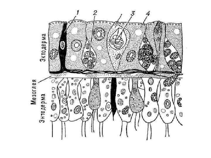 Строение пресноводной гидры • Тело гидр двуслойное. Между эктодермой и энтодермой находится базальная мембрана, или мезоглея.