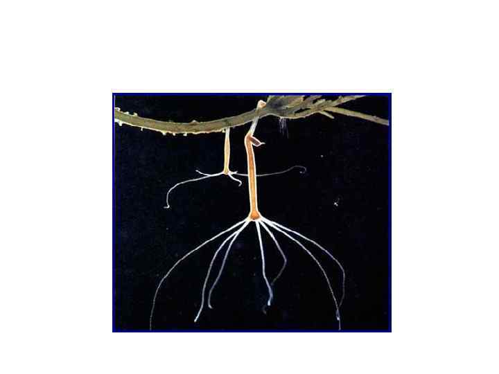 Морские гидроидные полипы • Колонии часто диморфны и состоят из полипов двух типов (Obelia). • Большая часть особей - гидрант- рот расположен на выступающем ротовом стебельке, вокруг - щупальца • Гастральная полость продолжается в общий стебель колонии. • Пища распределяется между членами колонии по каналам общей пищеварительной полости – гастроваскулярная полость.