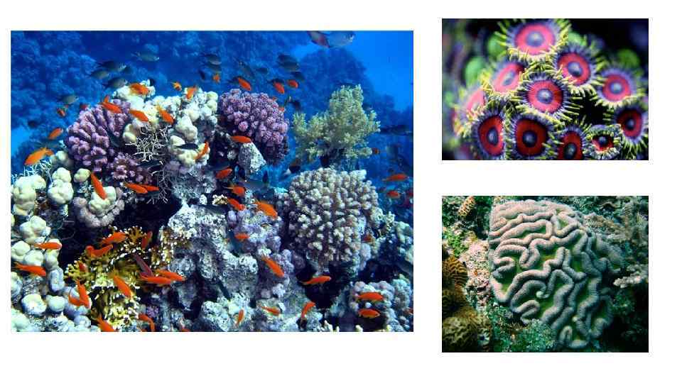 Класс Коралловые полипы • Колониальные и одиночные донные организмы. • Многие виды коралловых полипов обладают известковым скелетом и участвуют в образовании рифов. • Наряду с ними к этому классу относится множество представителей, скелет которых состоит из белка (чёрные кораллы), а также вовсе лишённых твёрдого скелета (актинии) • Кораллы размножаются и половым путем, образуя крошечные свободноплавающие личинки, которые в конечном итоге оседают на дно и дают начало новым колониям. Полипы, как правило, раздельнополые.