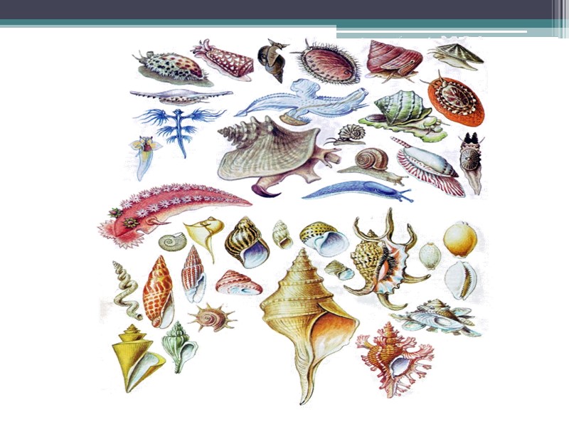 Число видов: 90 000 Образ жизни: свободноживущие Симметрия тела: нарушение симметрии: 1 почка, 1 жабра, 1 половая железа Размер тела: от 2-3мм – до нескольких десятков см Отделы тела: голова, туловище, нога Раковина: свернута в спираль либо редуцирована(слизни) Функция ноги: медленное передвижение по субстрату Пищеварительная система: в глотке – язык(терка) с зубцами, челюсти, слюнные железы Способ питания: активный захват пищи(в основном растительноядные) Дыхание: у наземных – легочное, у водных – жаберное Сердце: у большинства: 1 желудочек, 1 предсердие Половая система: раздельнополые и гермафродиты Органы чувств: осязания и зрения Развитие: У легочных – прямое, у жаберных – с метаморфозом(личинка – парусник)
