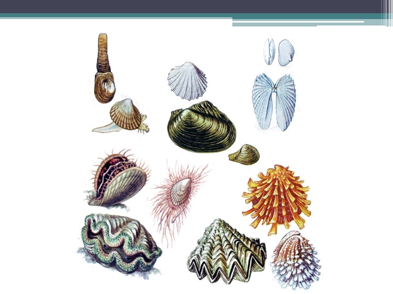 Число видов: 20 000 Образ жизни: свободноживущие, личинки временные паразиты Симметрия тела: двусторонняя тело сплюснуто с боков Размер тела: от 5 мм до 1,5 м Отделы тела: туловище, нога Раковина: двустворчатая Функция ноги: зарывание в дно водоема Пищеварительная система: вокруг рта пластинки, с ресничками, глотки и терки нет Способ питания: пассивная фильтрация воды Дыхание: жаберное Сердце: 1 желудочек, 2 предсердие Половая система: раздельнополые Органы чувств: равновесия и химического чувства Развитие: с метаморфозом
