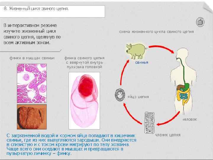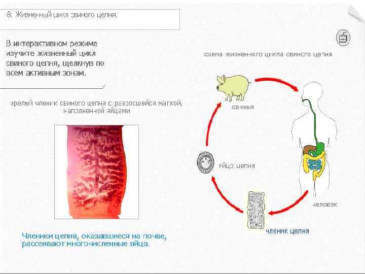 Цепень свиной (цепень вооруженный) Свиной или вооруженный цепень - паразитический плоский червь из класса ленточных червей, возбудитель тениоза, опасного заболевания человека. Встречается во всех странах мира. Жизненный цикл со сменой хозяев (окончательного и одного промежуточного). Половозрелые гермафродитные особи свиного цепня, достигающие в среднем 2 -3 м, обитают в тонком кишечнике человека, главным промежуточным хозяином являются свиньи.