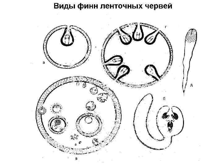 Финны ленточных червей 1. Цистицерк 2. Ценур 3. Цистицеркоид 4. Эхинококк 5. Плероцеркоид