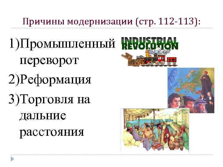 Причины модернизации (стр. 112 -113): 1)Промышленный переворот 2)Реформация 3)Торговля на дальние расстояния