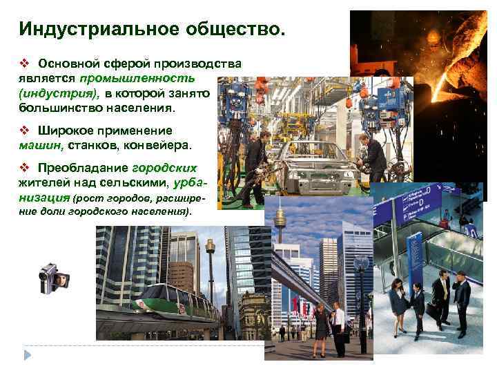 Индустриальное общество. v Основной сферой производства является промышленность (индустрия), в которой занято большинство населения. v Широкое применение машин, станков, конвейера. v Преобладание городских жителей над сельскими, урбанизация (рост городов, расширение доли городского населения).