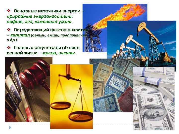 v Основные источники энергии – природные энергоносители: нефть, газ, каменный уголь. v Определяющий фактор развития – капитал (деньги, акции, предприятия и др. ). v Главные регуляторы общественной жизни – право, законы.