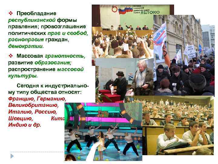 v Преобладание республиканской формы правления; провозглашение политических прав и свобод, равноправия граждан, демократии. v Массовая грамотность, развитие образования; распространение массовой культуры. Сегодня к индустриальному типу общества относят: Францию, Германию, Великобританию, Италию, Россию, Канаду, Швецию, Китай, Индию и др.
